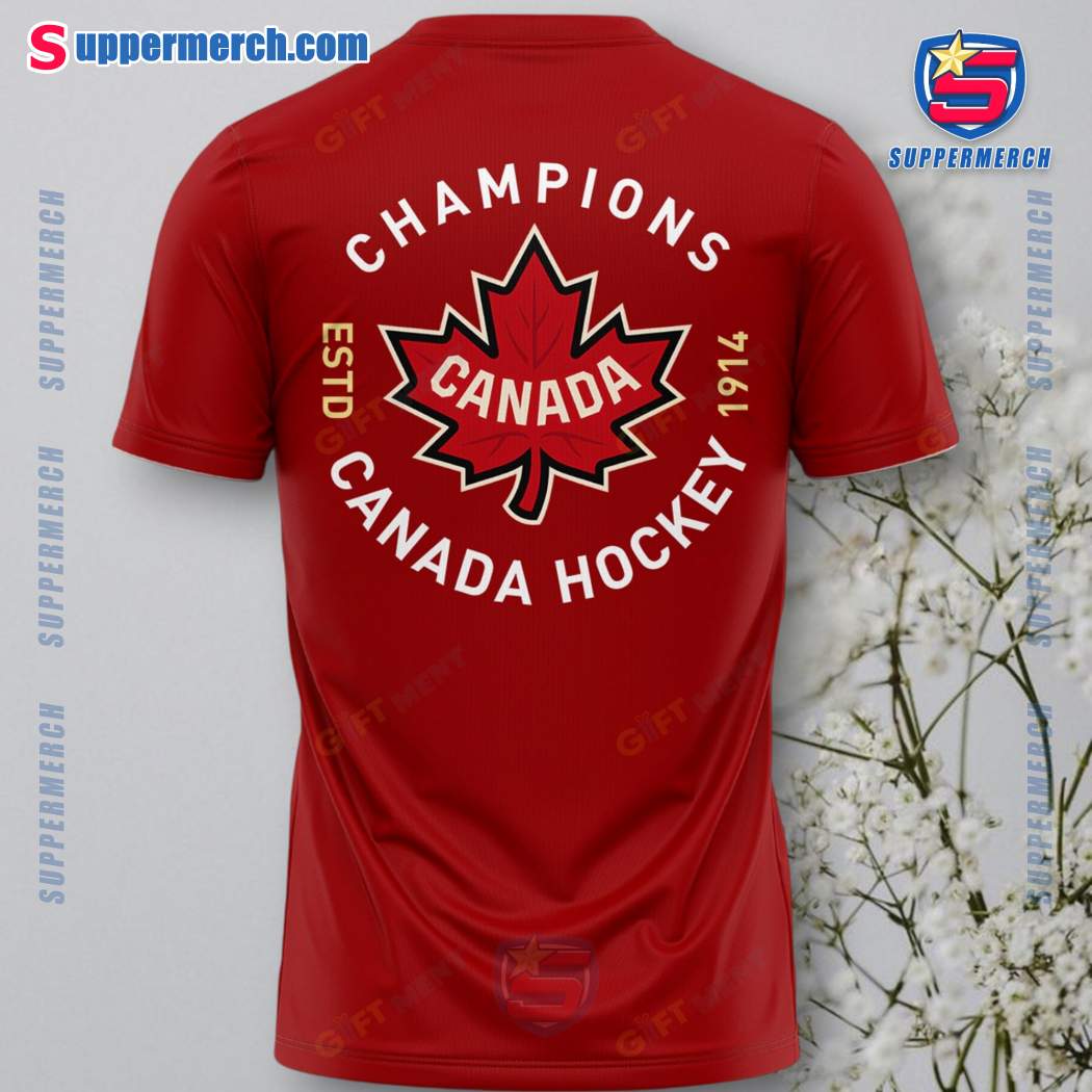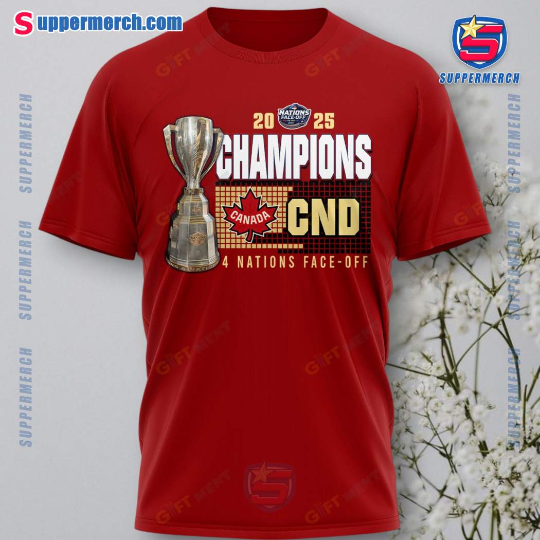 Keywords: Canada Hockey, 4 Nations Face-off, Champions, 2025, Hockey Shirt, All Over Print, T-Shirt, Hockey Fans, Sports Apparel, Canadian Pride, Suppermerch, Unique Design, High-Quality Print