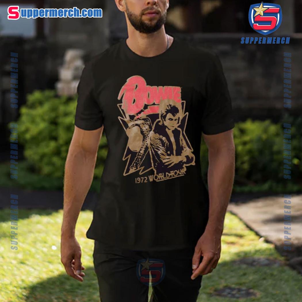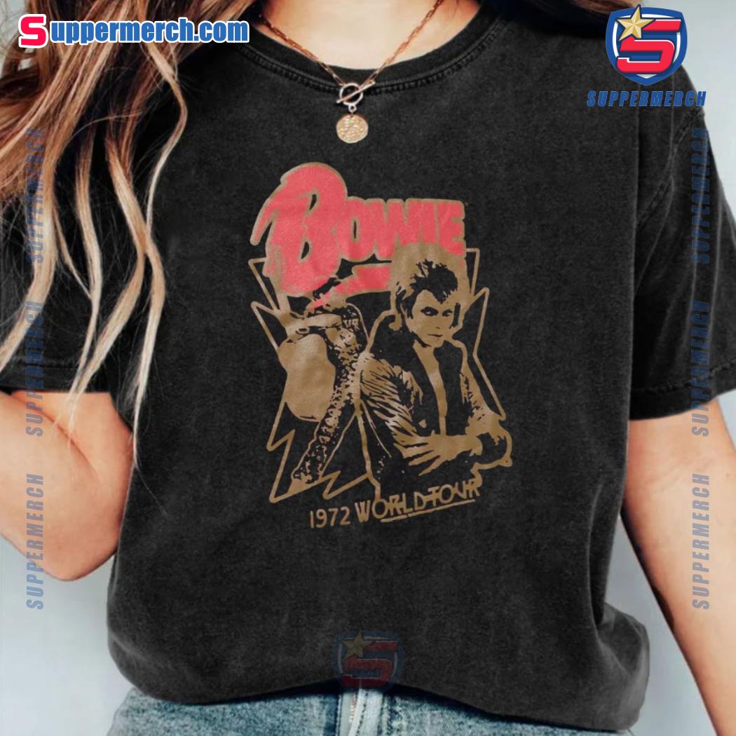 Keywords: David Bowie, 1972 World Tour, T-shirt, music, rock and roll, vintage, retro, iconic, legend, concert, tour, music lover, fan, tribute, graphic tee, streetwear, fashion, gift, collectible, cotton, comfortable, durable, classic fit.