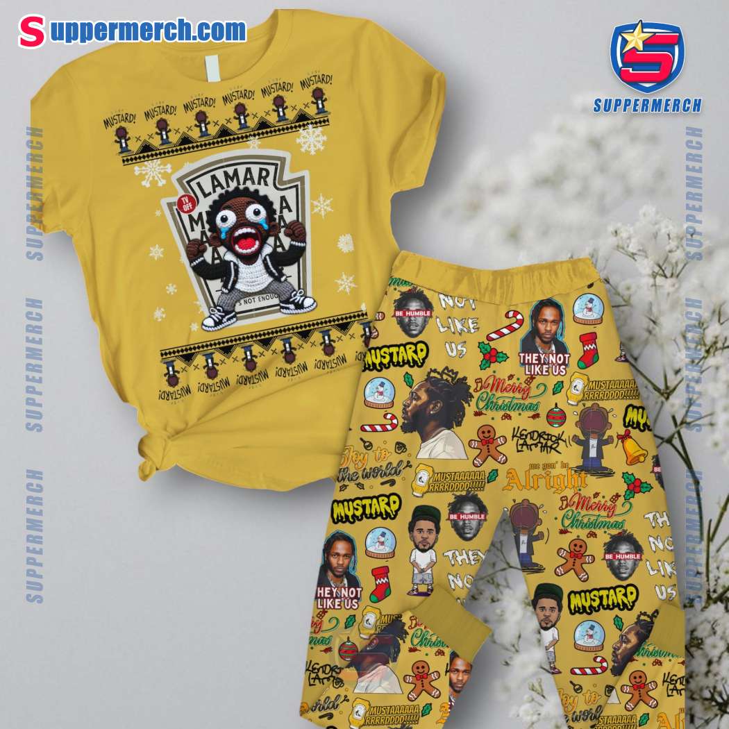 Keywords: Kendrick Lamar, Christmas pajamas, holiday pajamas, festive pajamas, mustard yellow, cozy pajamas, family pajamas, Christmas gifts, holiday gifts, rapper pajamas, music fan pajamas, Kendrick Lamar merch, hip hop pajamas.