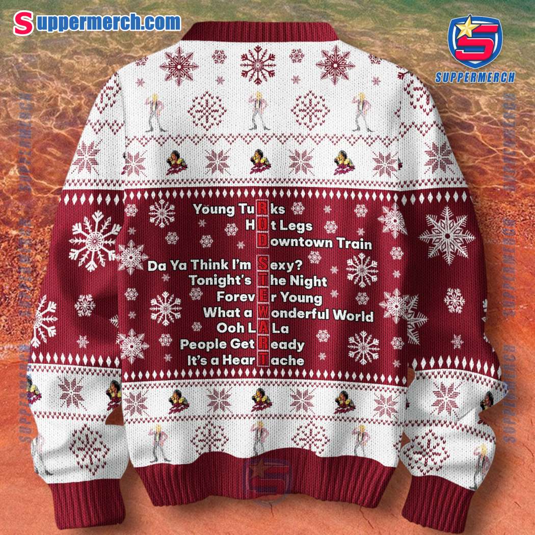This festive sweater is a perfect blend of classic rock and holiday spirit, featuring a stylish design that showcases the legendary Rod Stewart’s iconic song titles. It’s a unique and eye-catching piece that’s sure to spark conversation and make you the star of any holiday gathering.