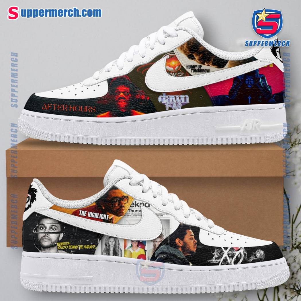 Keywords: The Weeknd, Air Force 1, Shoes, Sneakers, Album Collage, Trilogy, Beauty Behind The Madness, Starboy, After Hours, Dawn FM, Music, Pop, R&B, Hip Hop, Artist, Music Lover, Gift, Suppermerch, Print-on-Demand, Custom Design, Exclusive, Limited Edition