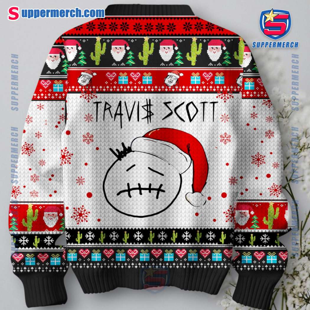 Keywords: Travis Scott, Christmas Sweater, Ugly Christmas Sweater, Holiday Sweater, Festive Sweater, Rapper Merch, Music Merch, Holiday Apparel, Christmas Gifts, Funny Christmas Sweater, Unique Design, High-Quality Print, Suppermerch